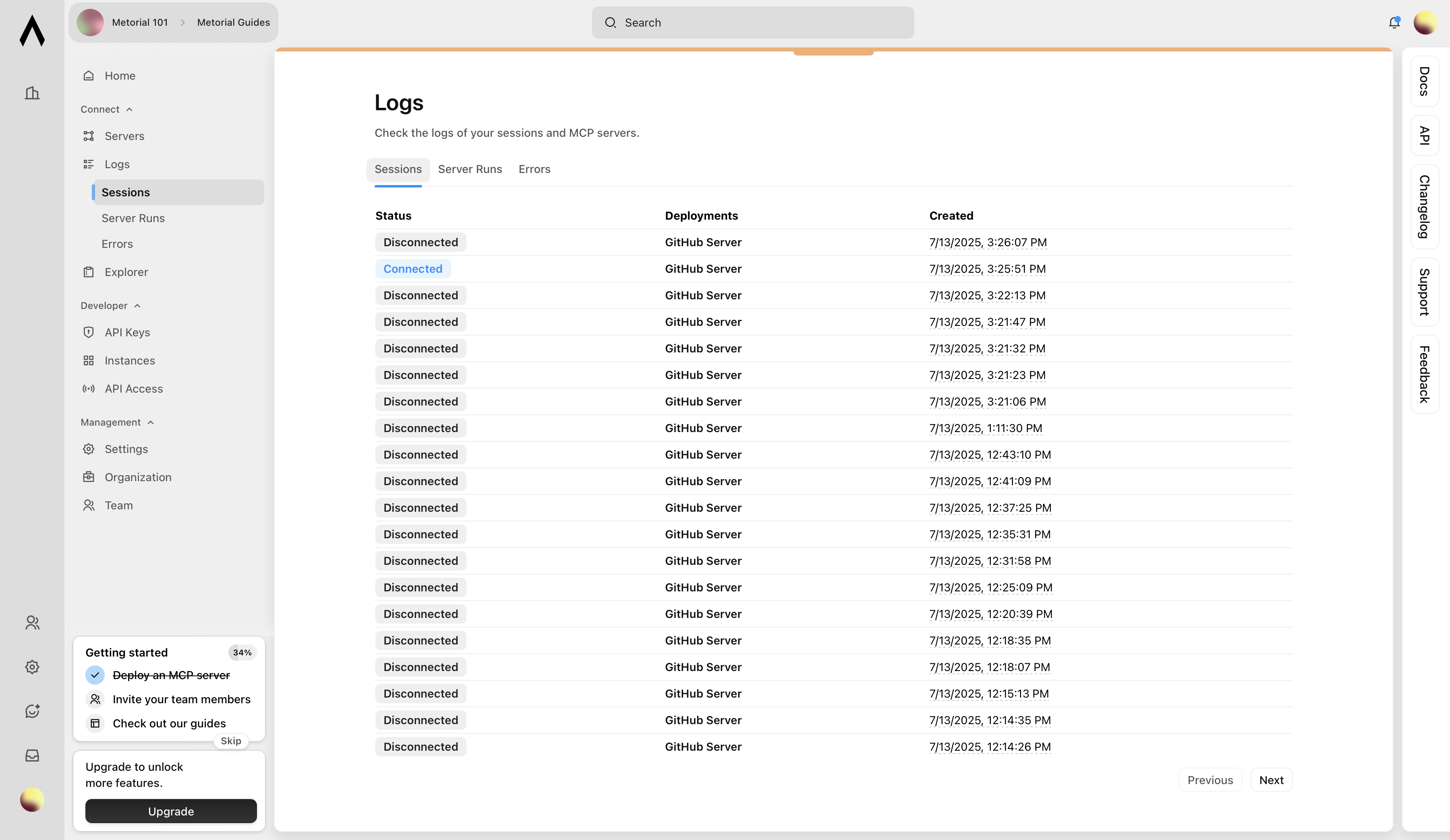 Navigate to Logs → Sessions in the sidebar to see every chat session that’s opened against your MCP servers.